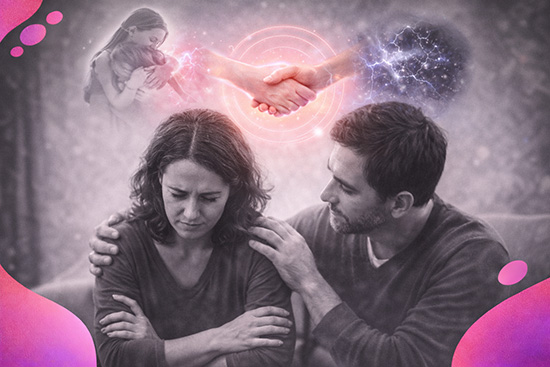 Deux personnes souriantes en séance, en noir et blanc, avec des accents rose et violet évoquant la sécurité et le lien durable